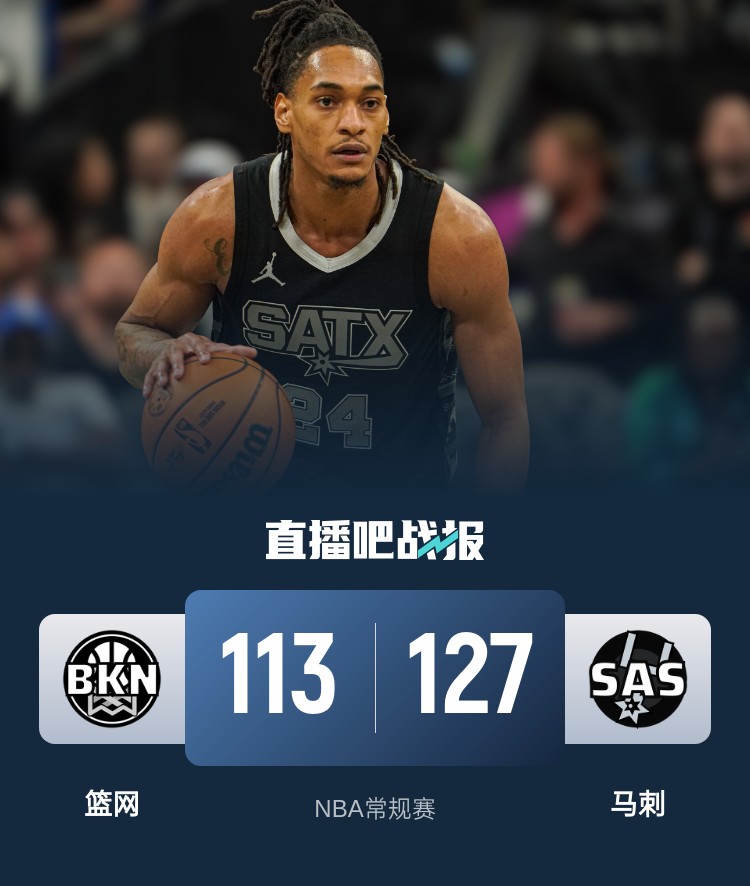 易边再战,马刺抓住开局机会,打出一波12-5的攻势,将领先优势扩大至两位数。此后马刺彻底接管比赛,瓦塞尔在末段连续命中两记三分,带领球队再送一波19-8的进攻高潮,将分差拉大至25分。巨大的分差让比赛早早失去悬念,马刺在末节保留主力阵容,稳稳守住大比分优势,最终主场轻取篮网,收获一场酣畅淋漓的胜利。