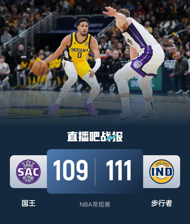 一开场,步行者率先发力打出16-6的开局,小萨冲击内线频频得手率队扳平比分,此后双方陷入缠斗,比分始终紧咬,国王稳扎稳打逐渐占据场上主动,半场战罢国王60-54领先步行者。下半场,国王占得先机将分差拉开到16分,步行者内外开花顽强咬住,末节双方争夺陷入白热化,关键时刻哈利伯顿和西亚卡姆相继命中三分,拉文上篮离谱三不沾,国王苦苦追赶无果。最终,步行者111-109逆转国王,主场过关。