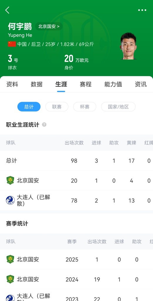 何宇鹏现年25岁,2024年加盟北京国安,本赛季前2轮中超为国安出战1次。